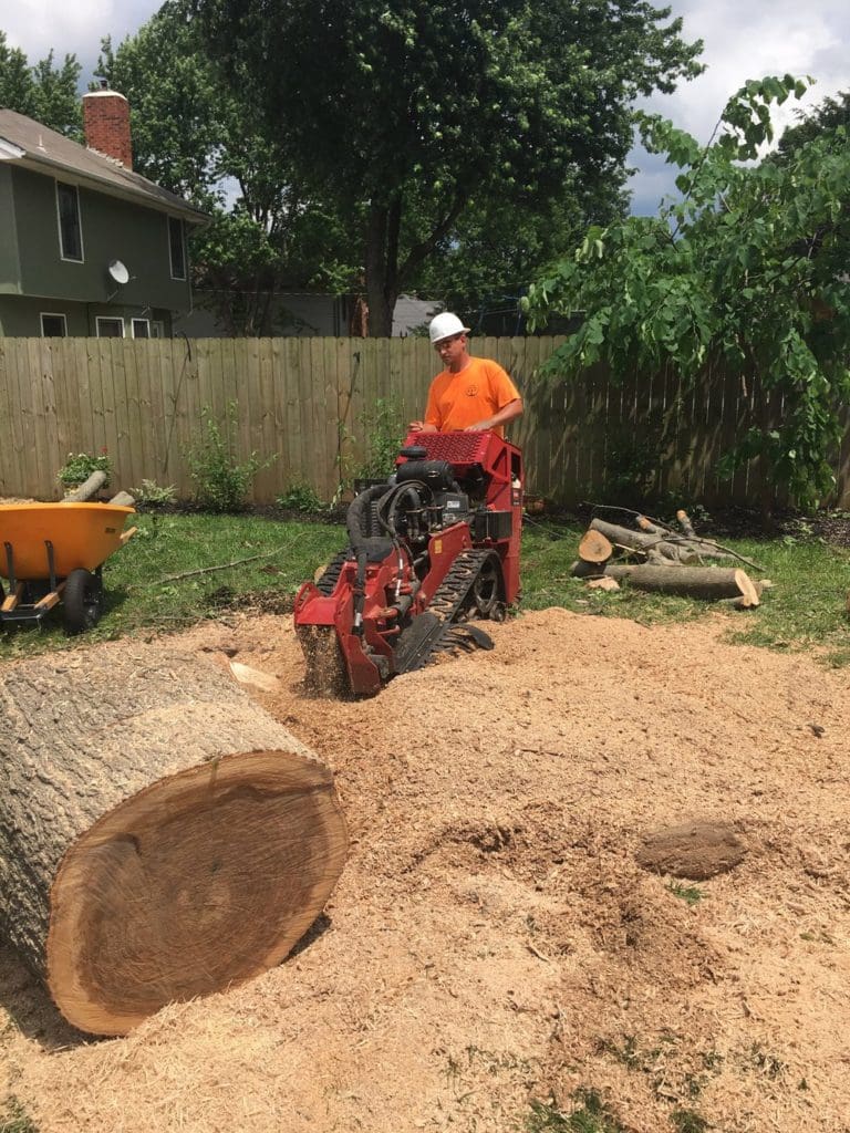 Stump Removal (or stump grinding) involves grinding the stump and roots down to 3-6 inches below the ground, then filling the hole with the wood chips from the stump grinding. Topsoil can also be used at your request. Learn more about Learn more about stump removal here.